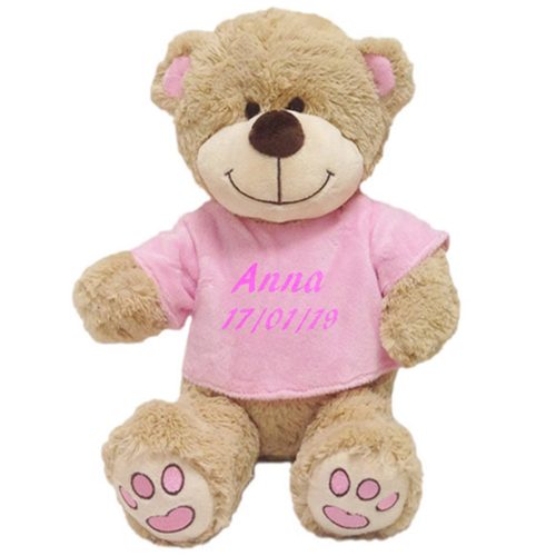 Personalise a teddy bear’s t-shirt today! We have a choice of three colours of bear: baby blue, baby pink and classic brown. ( NO IMAGES, TEXT ONLY)
